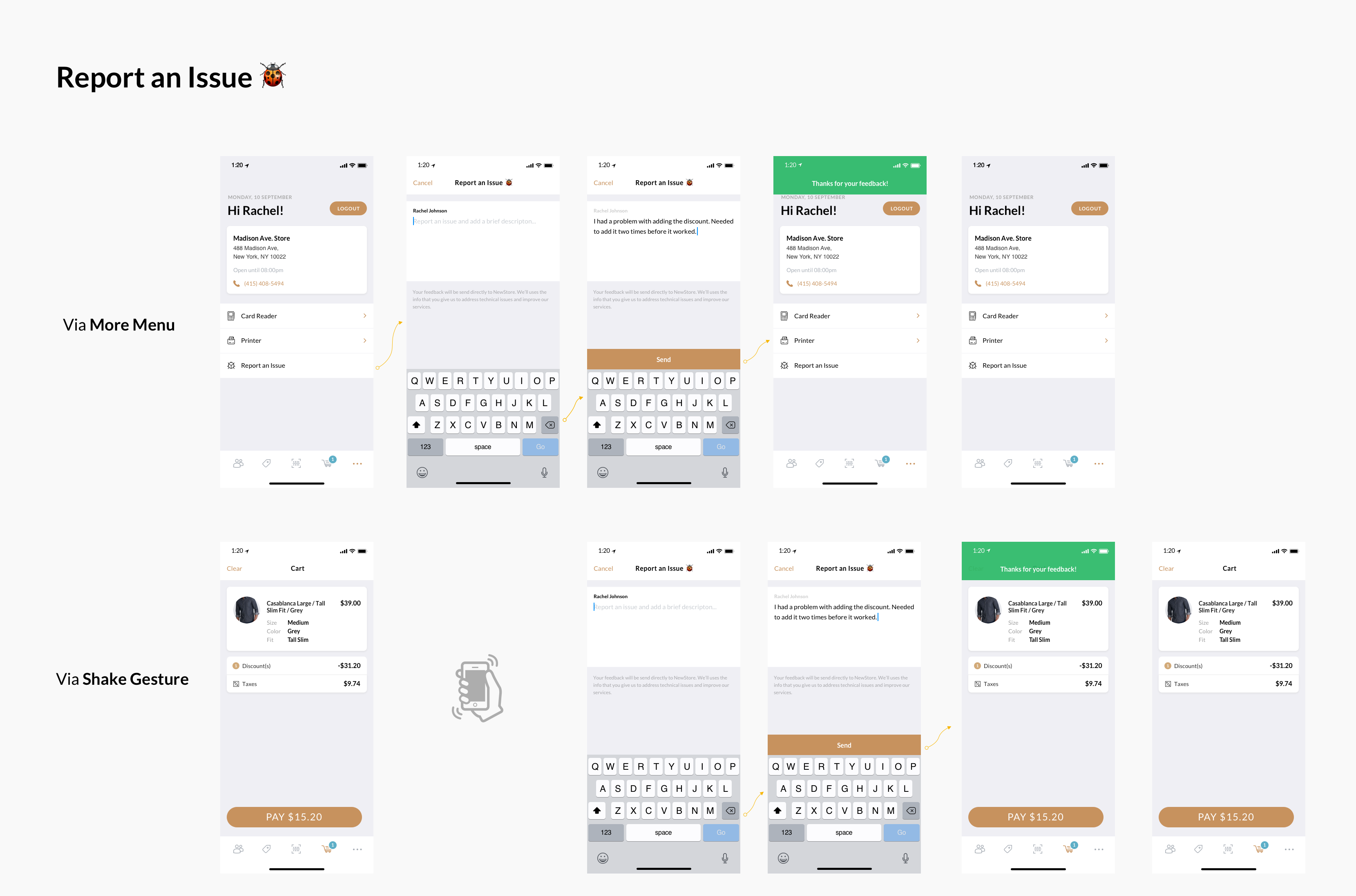 We scoped the work into two parts: First, come up with a user flow to capture the feedback, and second find a place to store it and make it available for support. The user flow we designed provided two ways to tell us what happened – a Report an Issue button and Shake to Report. For storing the feedback, the engineers suggested using Sentry to track the issue since it was already in place to identify crashes. At this point, both options for the user flow sounded like a good idea to me. Whenever something doesn't work, they would shake the phone and tell us.