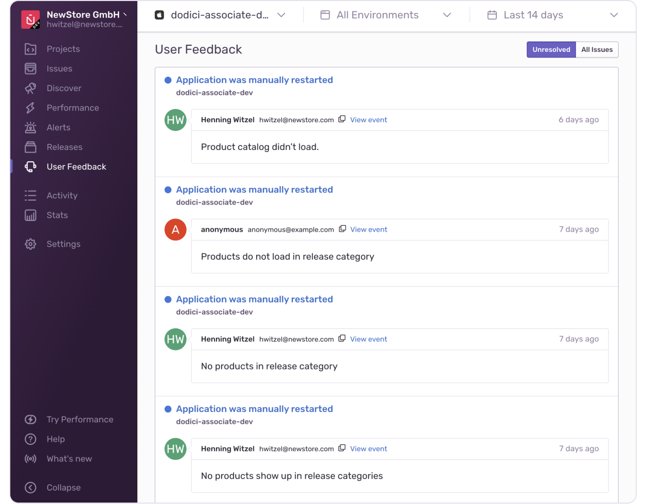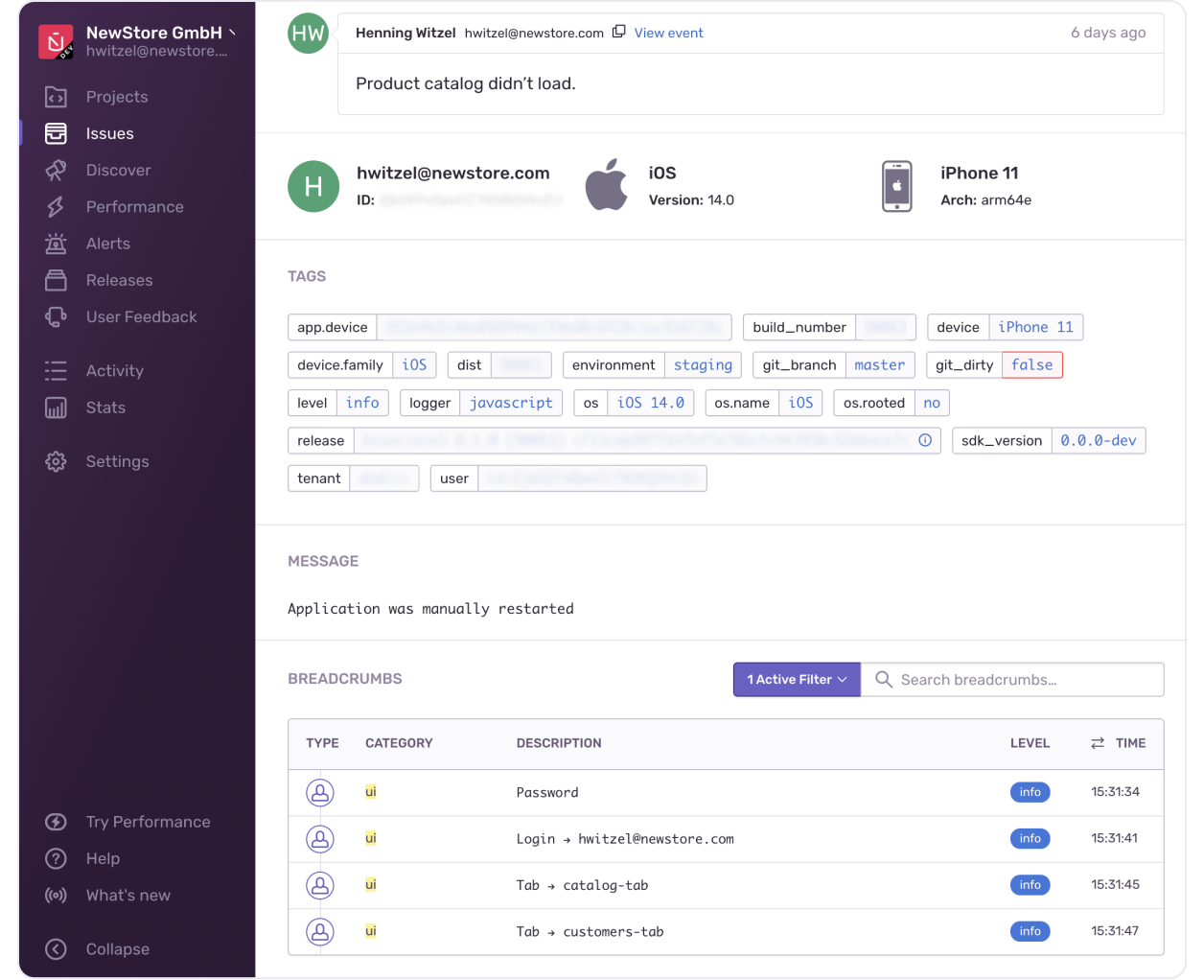 While trying to figure that out, we could already store the feedback in Sentry. Every report provides a broad set of information to understand what has happened, such as a breadcrumb with the UI interactions or data that got sent to the back end. Additionally, some metadata like the phone model, iOS version, and app version. In the two screenshots below you can see an overview of feedback reports and an example.