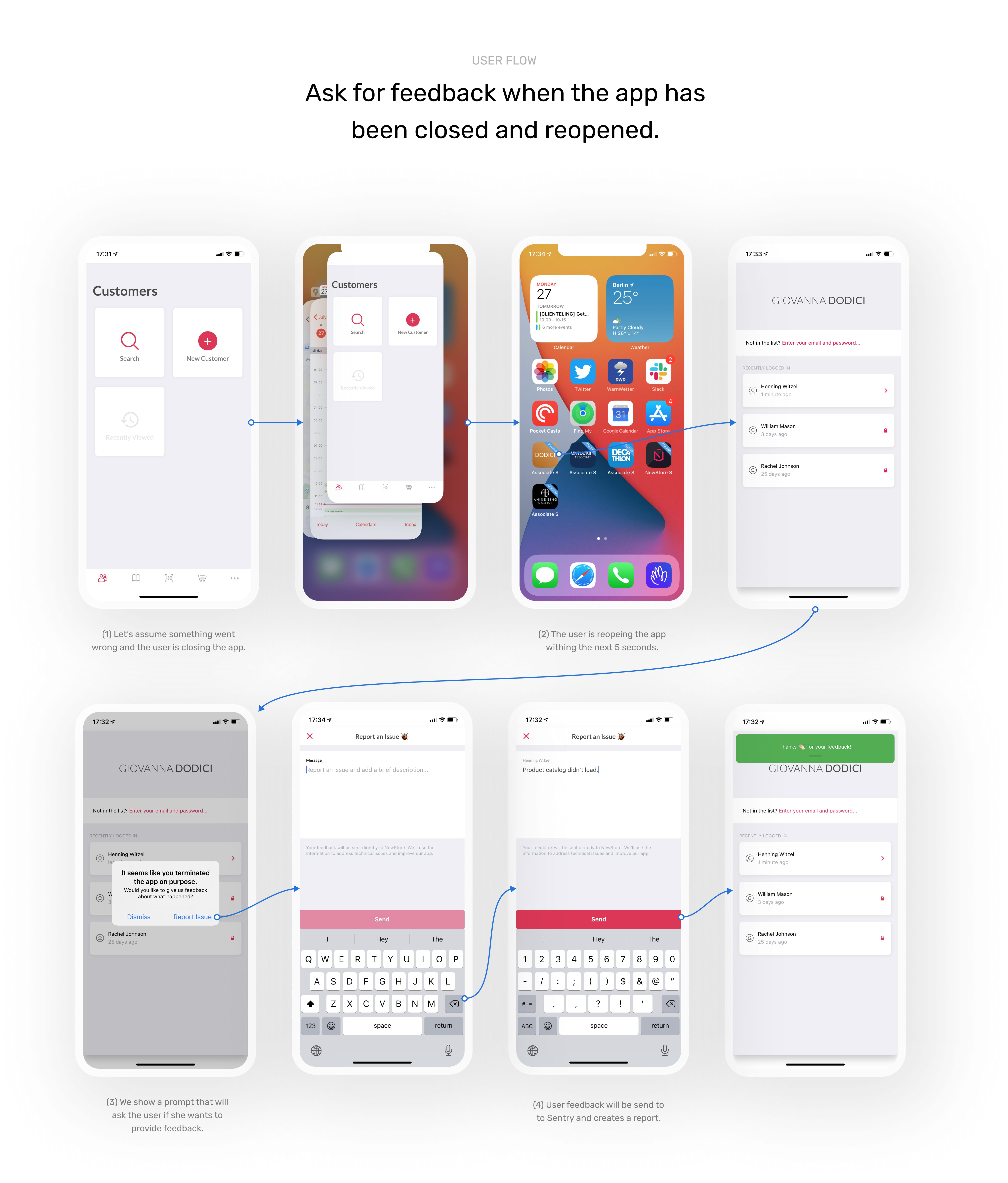 When the associate is closing the app and immediately reopens, we assume there was an issue, and ask for feedback. The idea for this came from an engineer on the team. After making sure this is actually feasible with iOS, we moved on with the implementation.